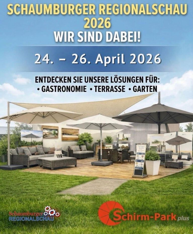 Auch in diesem Jahr ist Schirm-Park auf der Schaumburger Regionalschau (24.4 – 26.04.2026) vertreten. Besuchen Sie uns vor Ort und entdecken Sie unsere hochwertigen Sonnenschirme und Lösungen für Gastronomie, Terrasse und Garten.